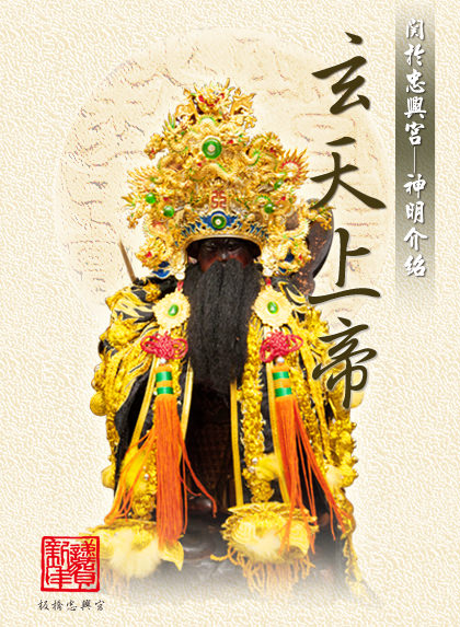 本名玄武大帝,全稱北極鎮天真武玄天上帝玉虛師相金闕化身蕩魔永鎮終劫濟苦天尊,通稱北極玄天上帝。常被簡稱為北帝、真武大帝或玄天上帝。其又有玄武神、真武神、元武神、玄武大帝、開天大帝、北極大帝、北極佑聖真君、北極蕩魔天尊等稱;俗稱上帝公、上帝爺公、上帝爺或帝爺公。 其象徵北極星與四象中的玄武,為統理北方之道教大神,北方在五行之中屬水,能統領所有水族與水上事物(故兼海神),因北方在五色中屬於黑色,又稱黑帝。玄天上帝亦是降妖伏魔之神、戰神,北帝據說擁有消災解困,治水禦火,護持武運及延年益壽的神力,故頗受擁戴。 |